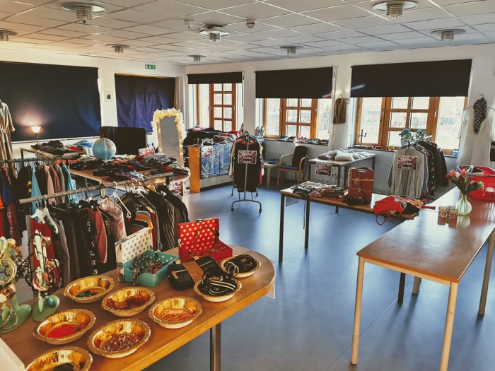 Här har klassrummet förvandlats till en butik med kläder och prylar som kan återanvändas. Foto: Sophie Bergdahl, Herrhagsskolan