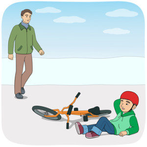 Han ramlar och slår sig. Hans pappa ser när han ramlar.
