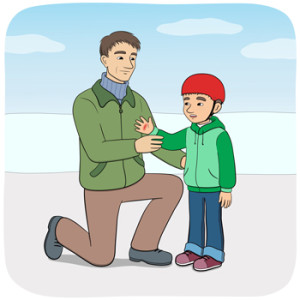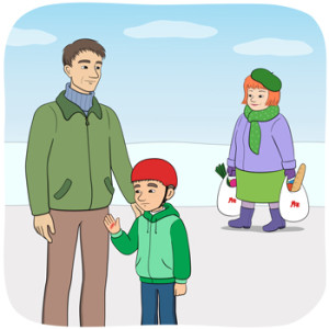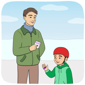 Pappa hjälper Mino upp. Det blöder. Men pappa har inga plåster.